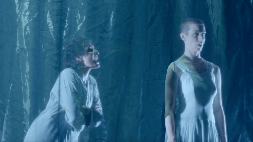 Ensemble A Light Blue Day/Ein hellblauer Tag: Derya Atakan, Merlind Constanze Pohl, Enrico Wenzel | Komposition: Andys Skordis | Text / Visuals: Jelena Vuksanovic | Bühne: Irena Kukric | Kostüm: Magdalena Klasnja | Video: Julian-Anthony Hespenheide | Regie: Miriam Götz